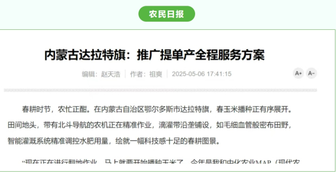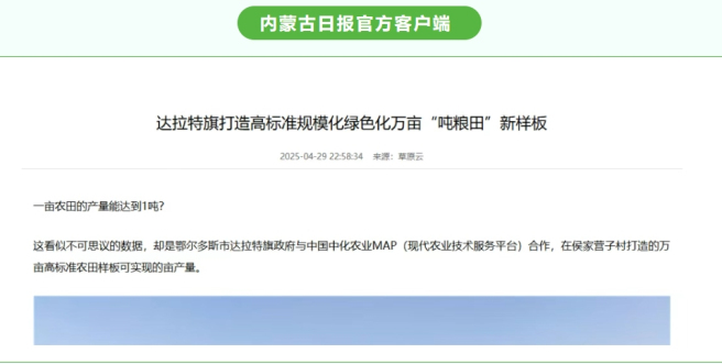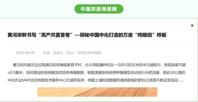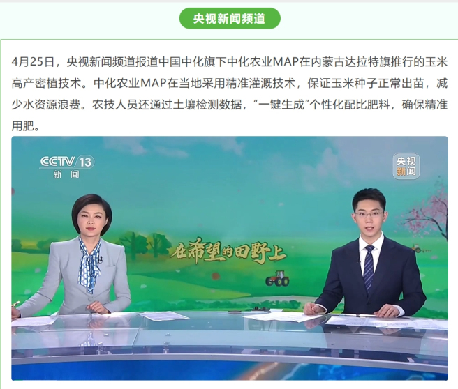 4月22日至23日,“打造现代农业样板 中化农业MAP助力千万亩吨粮田丰产——2025年中国中化媒体开放日”期间,多家媒体走进内蒙古达拉特旗、土默特右旗等地,见证中国中化旗下中化农业MAP在当地打造的现代农业样板的显著成效。