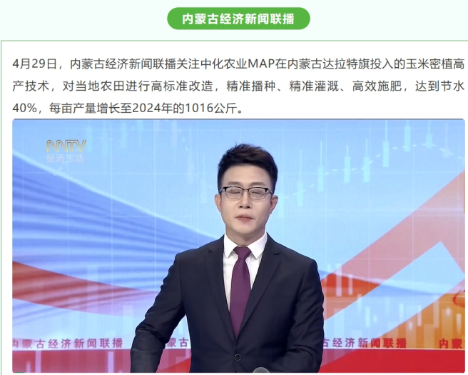 “一亩地浇多少水,施多少肥,不是凭经验拍脑袋,而是数据在说话。”中化农业MAP农艺师陈玉亮介绍,MAP智慧农业平台基于多年数据模型,结合土壤墒情、天气变化、苗情动态等信息,给出精准建议。“以往浇一亩地得三四百立方水,现在用两百多。”中化农业MAP鄂尔多斯区域经理张帅说道,2024年高产示范农场玉米亩产达到1016公斤,比周边农户平均高出20%左右。同时,每亩节水160立方米左右,增产的同时也节约了水资源。